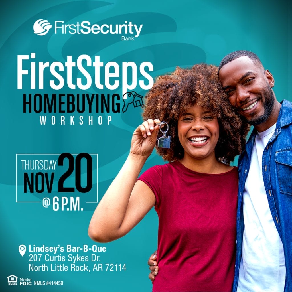 Join us for a FREE First Steps Homebuying Workshop on Thursday, November 20, at 6:00 p.m. at Lindsey’s BBQ (207 Curtis Sykes Dr, North Little Rock, AR 72114).